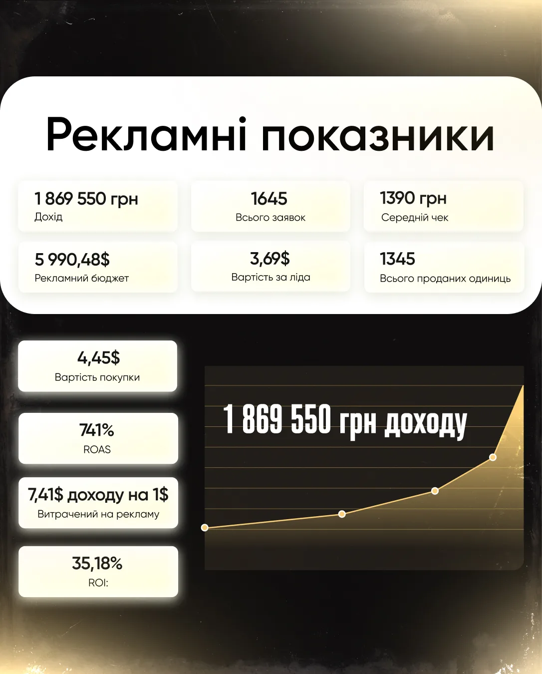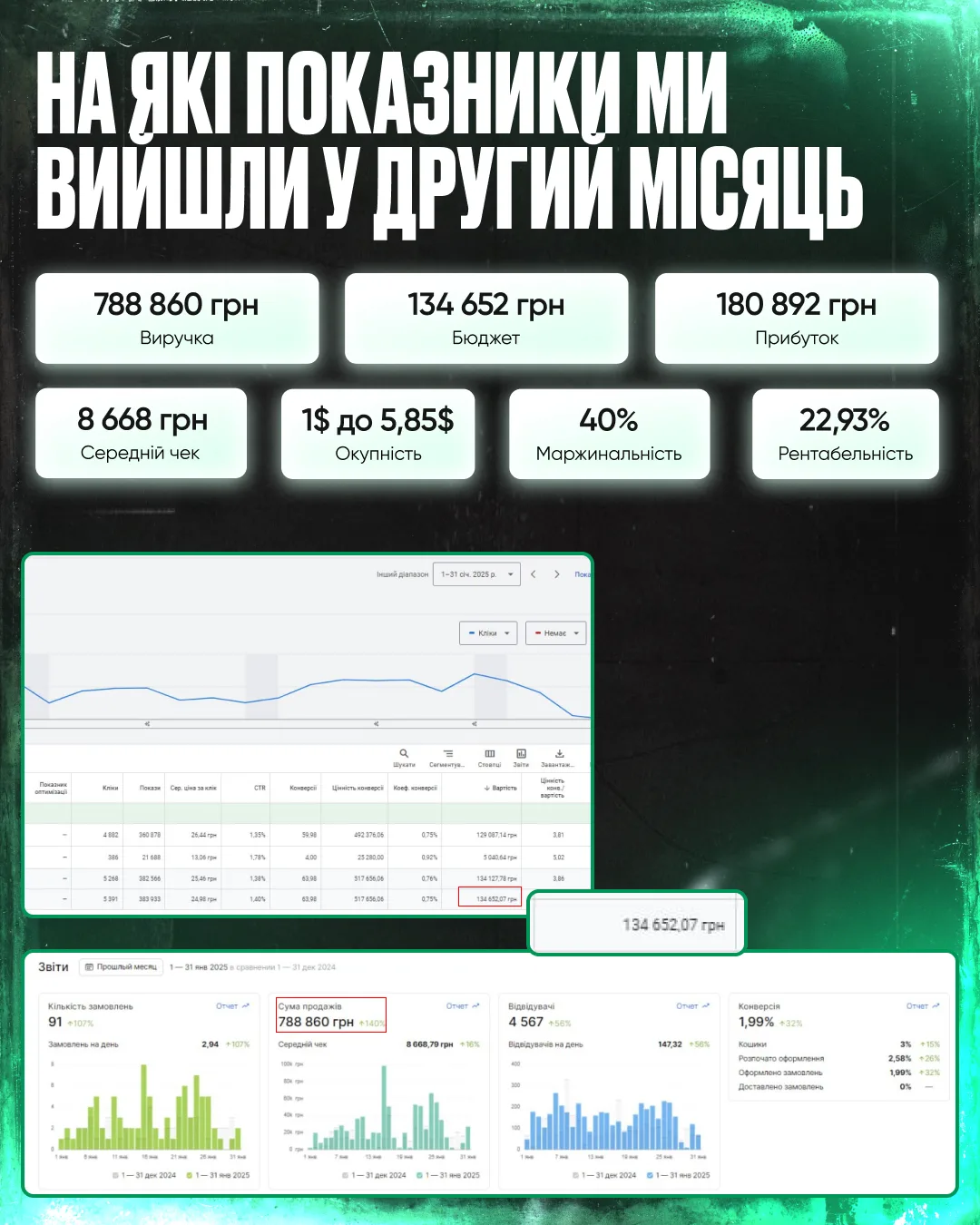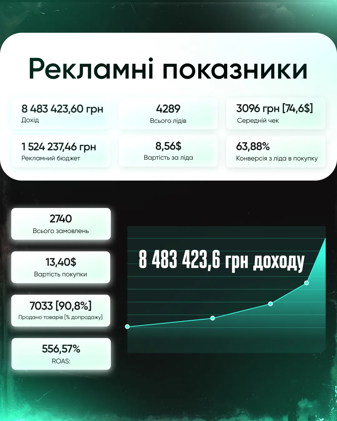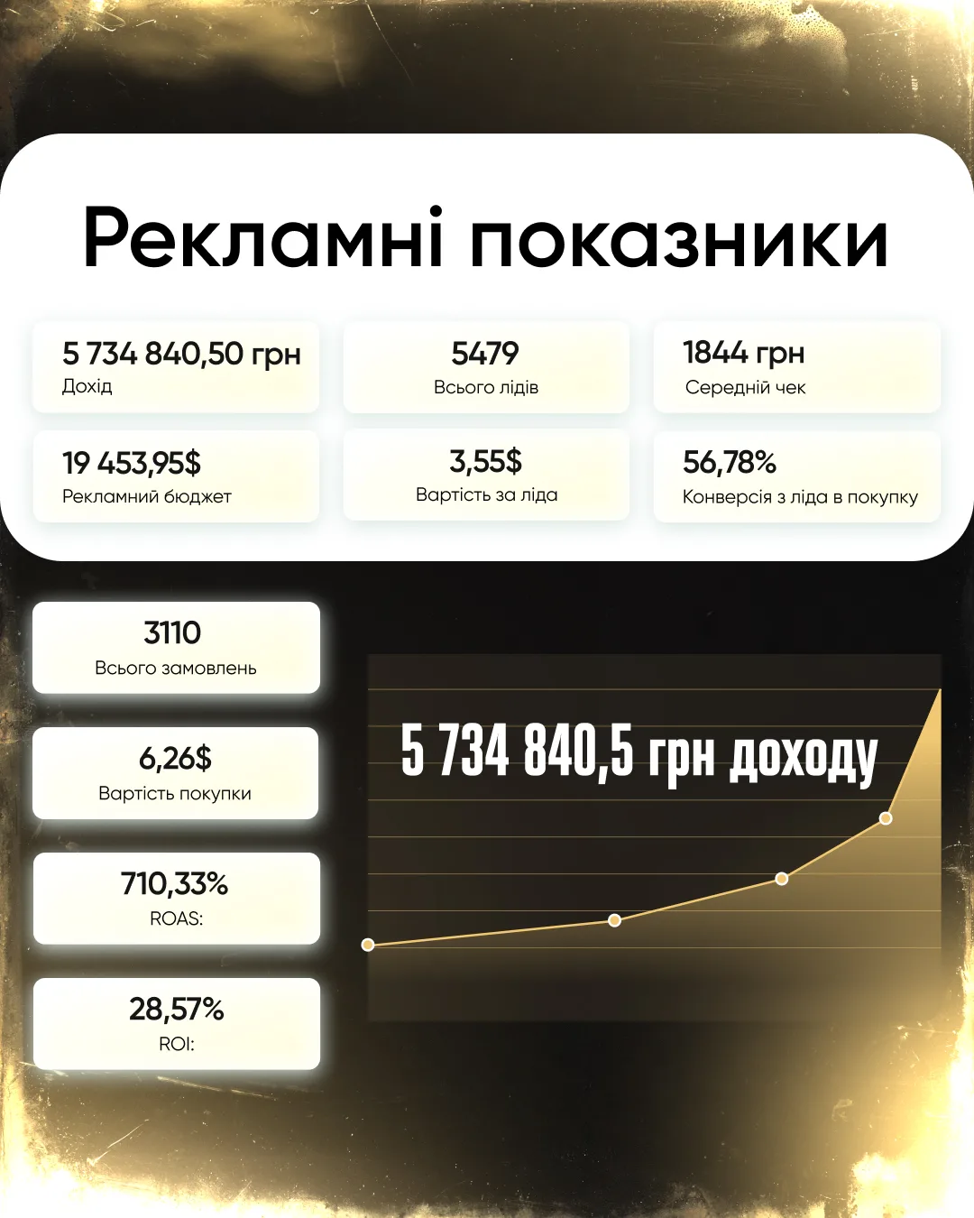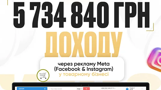 Кейс e-commerce: 5,7 млн грн доходу, з окупністю $1 → $7,1 , 3110 замовлень і вартістю покупки $6,26 через Meta Ads Подивитися кейс