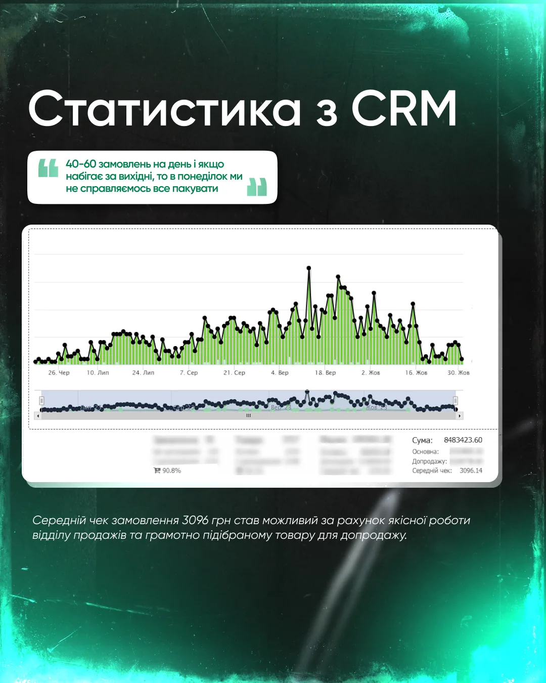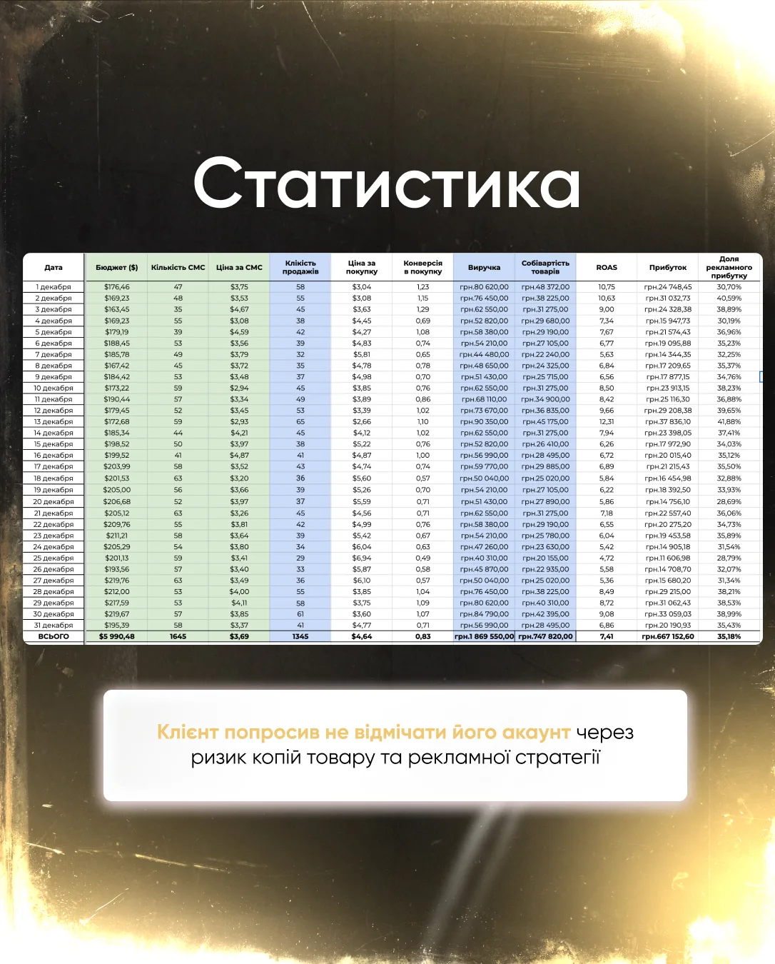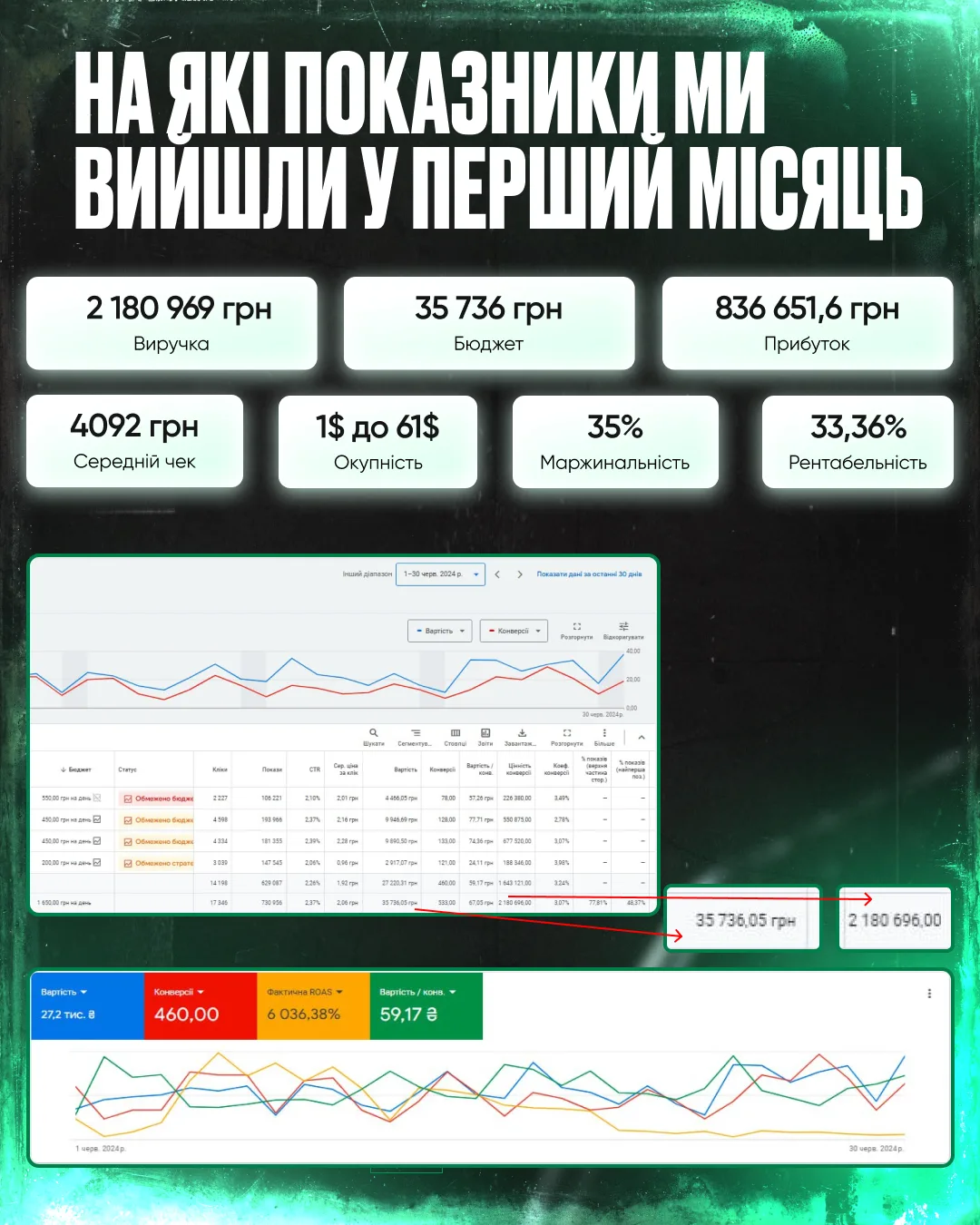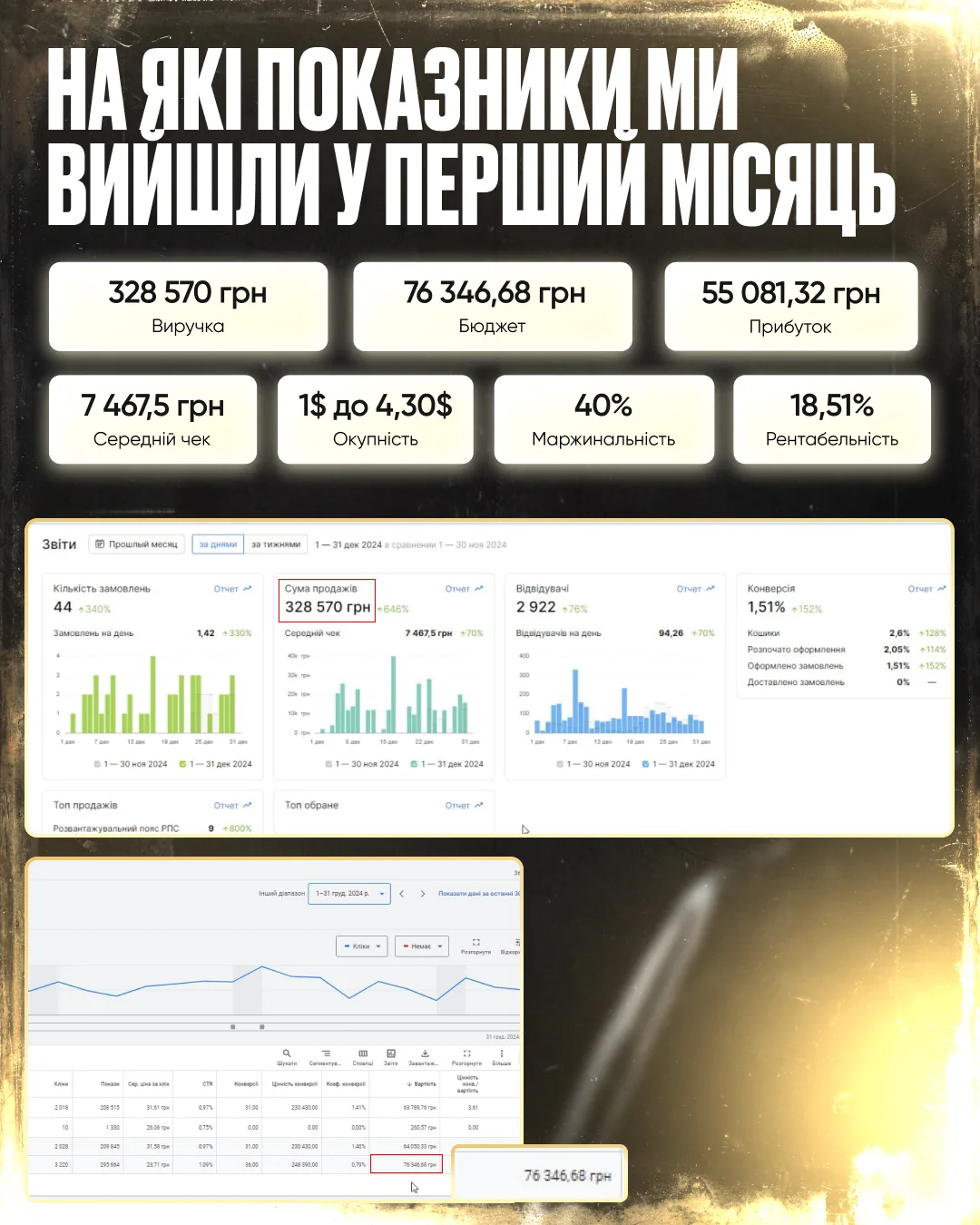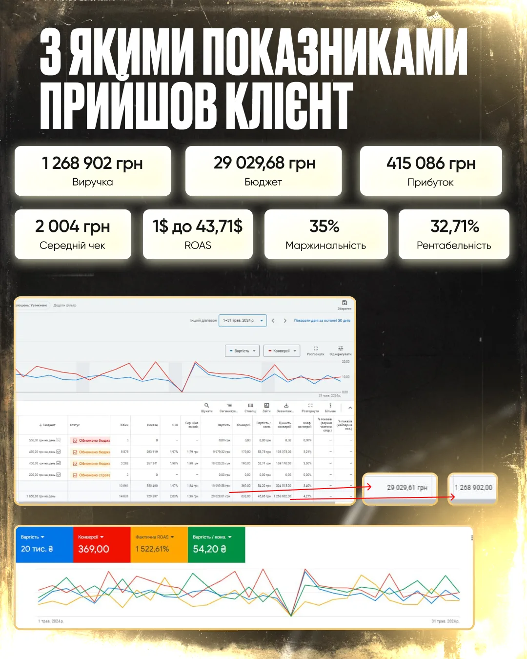 Кейс e-commerce: 5,7 млн грн доходу, з окупністю $1 → $7,1 , 3110 замовлень і вартістю покупки $6,26 через Meta Ads Подивитися кейс