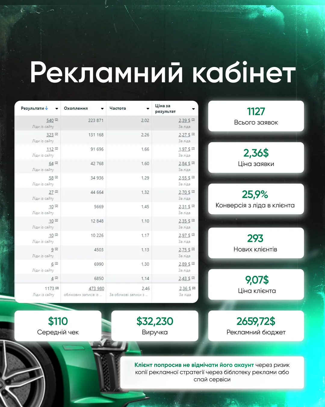 З $2659 бюджету ми отримали $32 230 виручки та 293 нових клієнтів — кейс з окупністю х12 в ніші детейлінгу Подивитися кейс